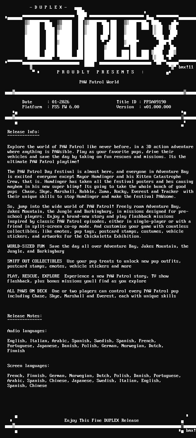 So, jump into the wide world of PAW Patrol! Freely roam Adventure Bay, Jake’s Mountain, the Jungle and Barkingburg, in missions designed for pre-school players. Enjoy a brand-new story and play flashback missions inspired by classic PAW Patrol episodes, either in single-player or with a friend in split-screen co-op mode. And customize your game with countless collectibles, like emotes, pup tags, postcard stamps, costumes, vehicle stickers, and artworks for the Chickaletta Exhibition.